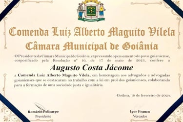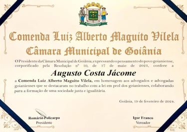 O Dr. Augusto Costa Jácome, sócio-fundador do escritório, é um advogado criminalista renomado, com mais de 10 anos de experiência exclusiva na área do Direito Penal. Sua carreira é marcada por uma defesa estratégica e comprometida com a justiça, tendo sido agraciado com a Comenda Luiz Alberto Maguito Vilela, uma honraria concedida a advogados que se destacam no estado de Goiás.